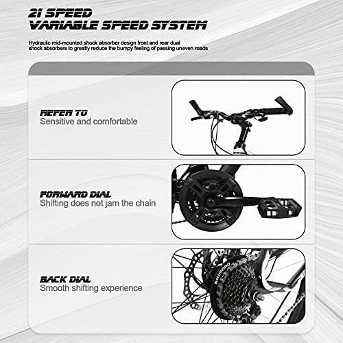 [High-quality Braking System]: With The Front And Rear Disc Brakes And 21-speed Transmission System, You Can Easily Choose Any Speed, And Have Perfect Braking And Excellent Full Suspension Riding Ability, Allowing You To Ride Easily.