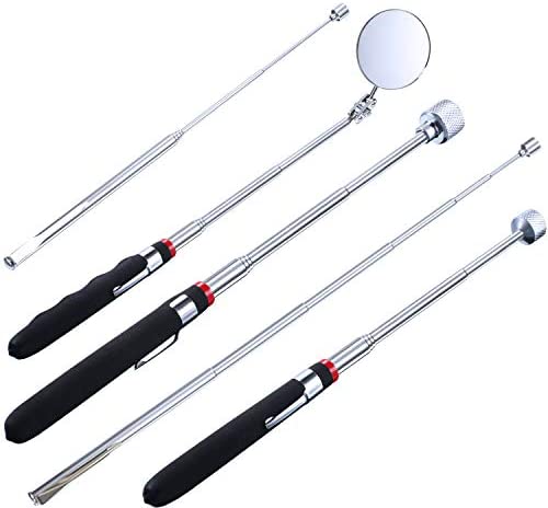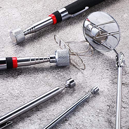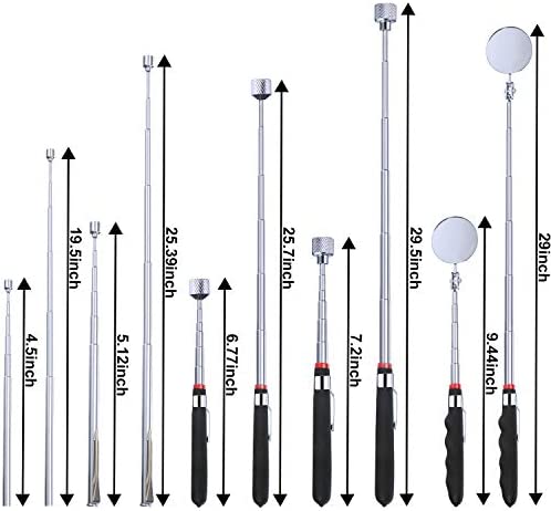 Telescoping handle and 360 swivel adjustable: 15 lb pick-up tool can be telescoped from 7.2 to 29.5 inch, 10 lb pick-up tool can be telescoped from 6.77 to 25.7 inch, while the 3 lb one is 5.12 to 25.39 inch, the 1 lb one is 4.5 to 19.5 inch; The round shaped inspection mirror can be telescoped from 9.44 to 29 inch