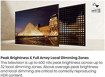 Peak Brightness/Full Array Local Dimming Zones: This television offers up-to-600 nits peak brightness across up to 32 local dimming zones. Above average peak brightness and local dimming are critical to correctly reproducing HDR content.