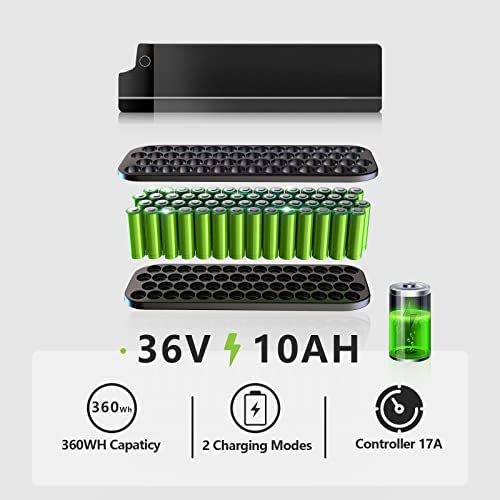 Removable Battery: Powered by a 36V 10Ah lithium-ion battery that can be quickly charged in 4 hours and has a range of 25+ miles when fully charged. With zero voltage function that it can protect the battery from over-discharge and damage, thereby extending the battery life. The battery is built into a waterproof aluminum case that can be removed at any time for easy charging at home or in the office