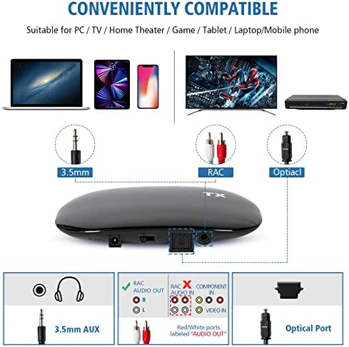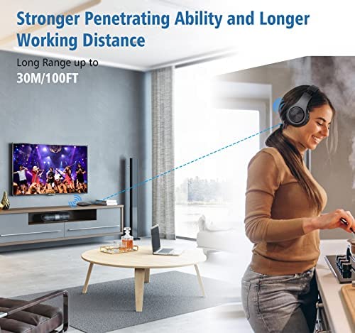 【Wide Compatibility】Compatible with all devices with Optical, 3.5mm Aux or RCA Audio Out ports, such as TV, PC, Laptop, Set Top Box, TV Box, Phone, tablets, MP3, iPod, VCD, DVD, Hi-Fi Stereo System, VCR, CD player etc. An RF transmitter support multiple headphones for simultaneous listening