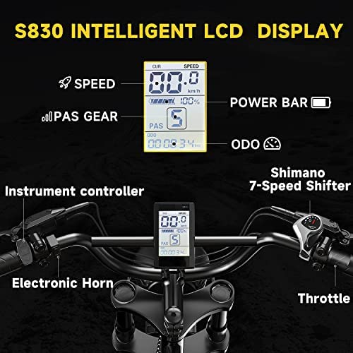 【EXCELLENT RIDING PERFORMANCE】The S4 e bike is great for mountains, city, sandy, snow. Customize your ride performance with 3 riding modes and Shimano 7-speed. The perfect hydraulic braking and lighting system fully protect your safety.
