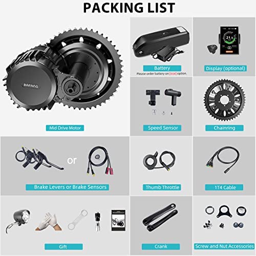 🚴[ PACKING LIST & GIFT ] What will you receive in this order ? A 1000W middrive motor , a Battery , a display (optional), chainring , speed sensor , brake levers , cranks , 1T4 EB-BUS cable , thumb throttle , lock nuts . The free gifts includes headlight , wrench , crank removal tool and gloves. We prepare everything you need, just place an order now. Please kindly note that if you want to keep your original hydraulic brakes, please email us after your purchase