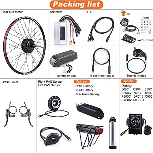 🚴 PACKING LIST 🚴 What will you receive in the box? A rear cassette wheel hub motor with rim & spokes , a controller and its outer box, a display (optional), a battery and charger (if you order the battery together), brake levers, 1T4 cable , thumb throttle , left and right PAS , headlight , stickers and manual. Everything is preapared, just start your eBike kit conversion when you receive it