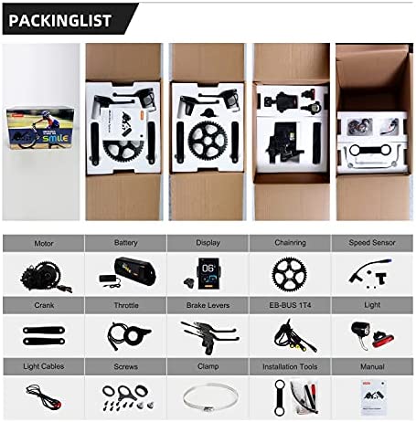 【Complete Accessories】 Equipped with all necessary accessories: Mid-drive motor M625 50.4V 1000W (The Newest Version68-73MM and 100MM), brake levers, thumb throttle, 46T chainring wheel, cranks, LCD DPC 181 CAN. display, blue tooth with USB, Separate speed sensor and magnets,1T4 wire, nuts, 50.4V battery, Free Gift ( Ebike headlight and taillight, clamps and Install accessory tools) and User Manual