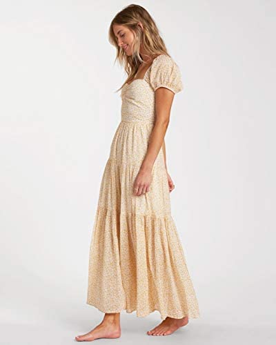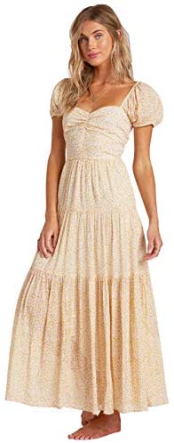 Printed woven maxi costume with sweatheart neckline and puff sleeve element.