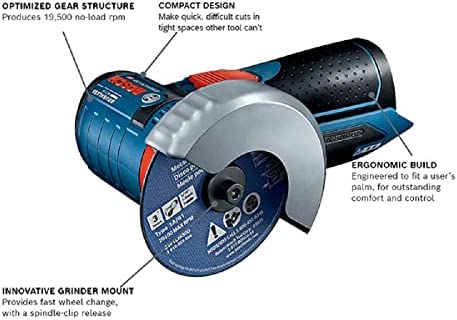 The Bosch GWS12V-30 12V Max 3 In. Angle Grinder is ideal for the pro who needs a compact powerhouse to get to those quick, difficult cuts in tight spaces other tools can’t. With its brushless motor design and optimized gear structure, this efficient grinder produces 19,500 no-load rpm at only 1.5 Lbs. (tool only, not including battery). The grinder was engineered to fit the palm of a user’s hand, for outstanding ergonomics and control. This versatile tool is powerful enough to cut threaded rod, strut, conduit, tile and more. It features an innovative gear-mount design for fast wheel change; just pull the locking clip and unscrew the spindle screw. It also features fast braking time, stopping the wheel after the grinder is turned off.