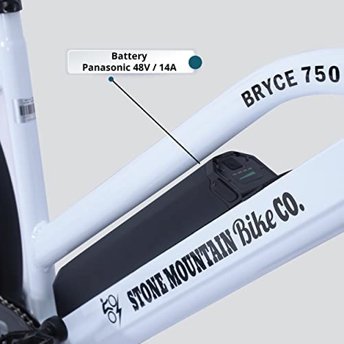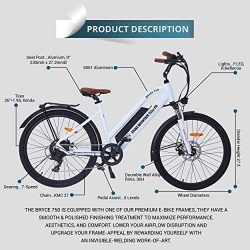 Bryce 750 27-inch Electric Bike for Adults, 500-watt Motor, 48-Volt, 13-amp Battery, 28-mph top Speed, USB Phone Holder, Shimano 21-Speed, Removable Battery, LCD Display, White Color, Beige seat
