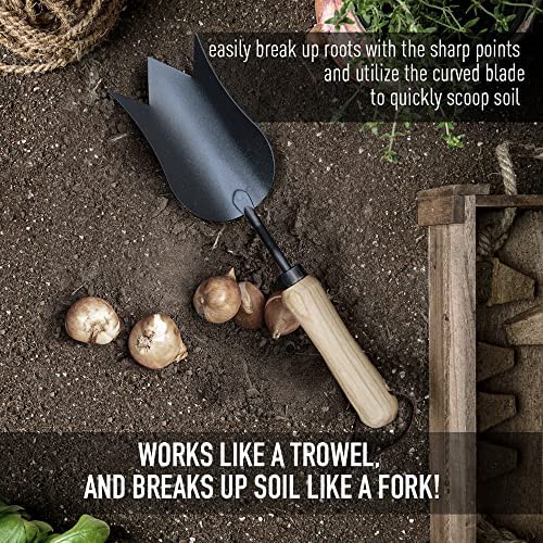 【TULIP TROWEL】 – Works like a trowel, and breaks up soil like a fork! An specialized take on the standard trowel, built with sharpened edges and three points. Easily break up roots with the sharp points and utilize the curved blade to quickly scoop soil.