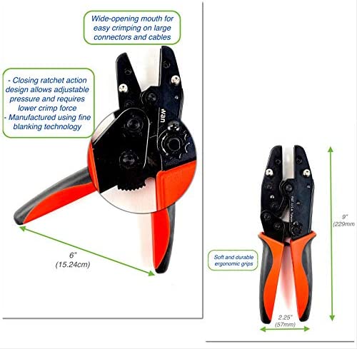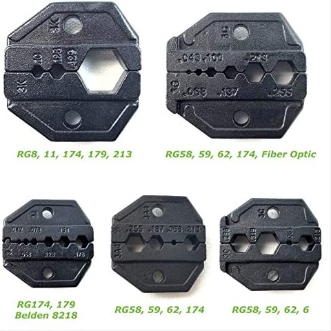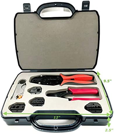 COAX Quick Interchangeable Ratchet CrimpingTool Kit contains: 1. Tool-less Quick Change Ratchet Crimping Tool Frame 2. Cable Cutter HT-206 For wire O.D. up to 0.41″ 3. 5 interchangeable die sets.