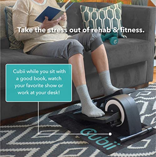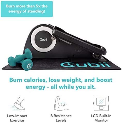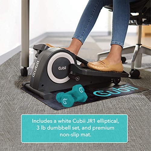 UNDER DESK ELLIPTICAL WITH DUMBBELLS AND NON-SLIP WORKOUT MAT BUNDLE- Get fit while you sit! Cubii JR1 pedal exerciser bundle is the leading compact and ergonomic mini elliptical that lets you workout or rehab while you sit at home or the office. Comes with Cubii non-slip workout mat and 3lb dumbbell set