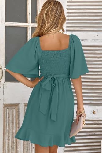 Dokotoo Women’s Wrap V Neck Short Flared Sleeve Smocked Elastic Waist Tiered Belted Ruffle Hem Party Short Dress