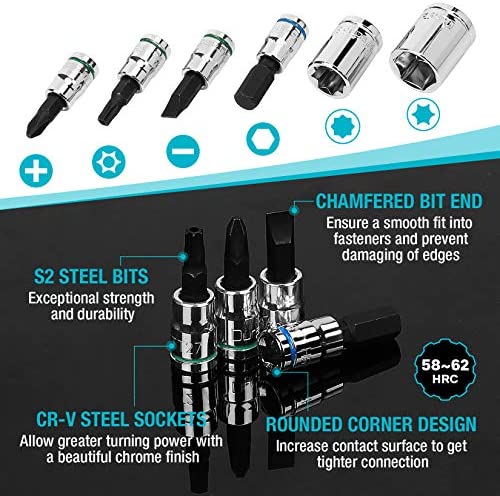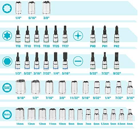 【What Will You Get】This 51 piece 1/4-in tool set contains 10pc 6 point standard socket(3/16″-9/16″),13pc 6 point metric socket(4mm-14mm),3pc 8 point standard socket(1/4″-3/8″),18pc bit socket.3pc extension bar(6″/3″/1.5″),1 universal joint,1 spinner handle,1 90 tooth ratchet,1 breaker bar