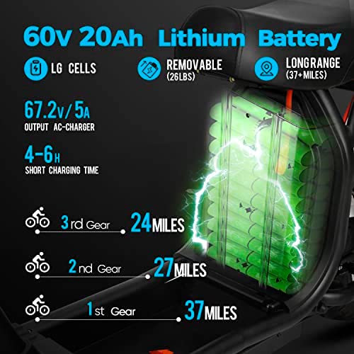 【🛵🛵Powerful&Farther】2000W brushless Motor makes Eahora H10 Electric Motorcyclr runs 28MPH,Connected with the 119N.m surging torque, eahora H10 electric motorcycle have smooth ride&short-term acceleration on the unprecedented 92% high efficiency. Climb 30 degree slope. Easy and comfortable to ride! 10in motor saves more electric, 60V 20Ah makes Eahora H10 runs to 37miles. CHARGE FAST under 67V 5A charger about 4-6hours.