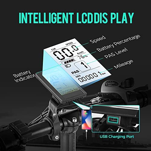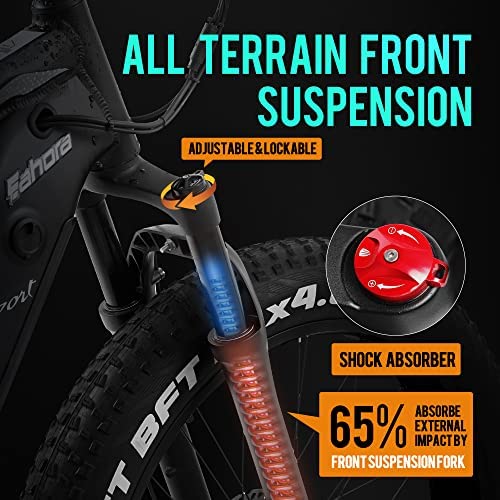 🎈🎈[Features Of eAhora E- Bike]: Equipped with adjustable stem, seat, step-thru frame, multi-functional LCD display, hydraulic disc brake system, hydraulic suspension fork, high brightness front & rear light and anti-skidding fat tires, helping ride with an upright, relaxed riding posture for a more comfortable riding experience. eAhora E-Bike can ride on snow, beaches, rugged mountain roads, cities etc.
