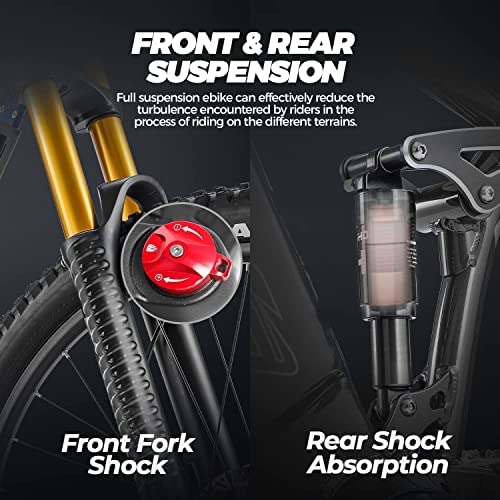 【🎃🎃Full Suspension】Lockout front suspension: Effectively reduce the shock caused by road bumps. Rear Hydraulic suspension has excellent grounding and pedaling efficiency. It can decouple braking forces. Less Bumps, More Comfort