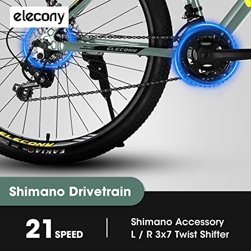 【21 Speed Shimano Mountain Bike】Shimano trigger shifters combines with the rear Shimano derailleurs to deliver gear changes easy and smooth, for uphill Climbing, downhill riding, or pure acceleration, to keep you pushing through any terrain in your path. 3 gears front derailleur and 7 gears derailleur deliver 21 speeds of ultra smooth shifting