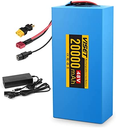 Battery comes with 54.6V 2A Charger, XT60 male and female connector to your. When the battery is fully charged, the light of the charger will turn green. Do not continue charging after it is fully charged, which will also shorten battery life. Please note that the voltage of the 48V 20ah battery is 54.6V after being fully charged, which may fluctuate up and down by 1-2V, which is a normal phenomenon.