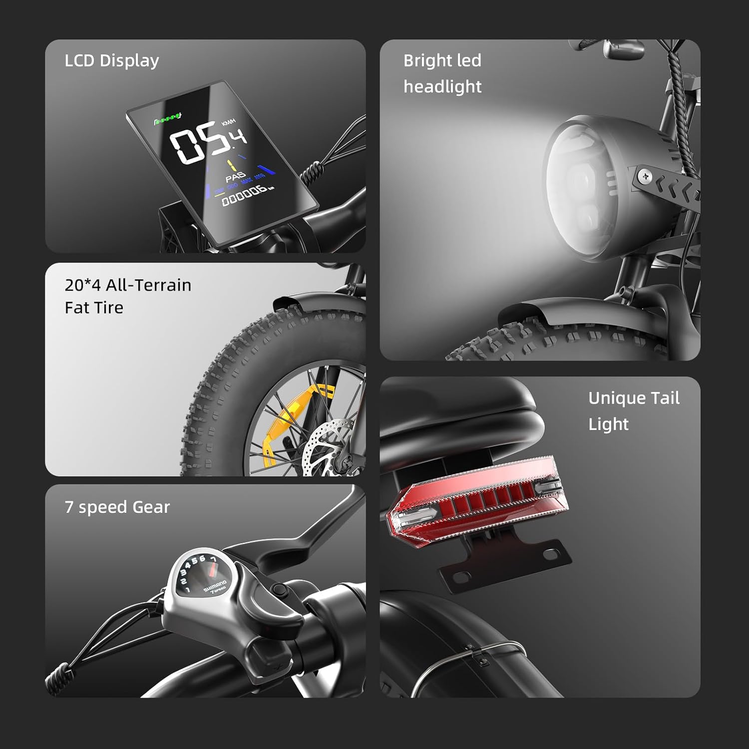 【Safety and Stability for Optimal Riding Experience 】 Our Dirt Electric Bike for Adults features a 5-stage full suspension system including two fork spring dampers, a seat spring damper and two 20 ” puncture-proof fat tires that absorb shocks and bumps. Conquer all terrains with confidence. Dual disc brake system reduces braking distance for safer and more reliable riding even in extreme weather conditions