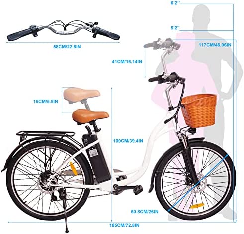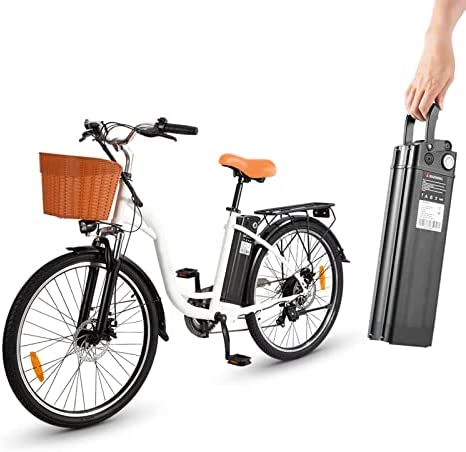 Super High Cost Performance & Rich configuration:This is a practical ebike that whole family can ride,come with adjustable seat,water proof removable battery with key&lock(Easy to take off and anti-theft),baseket,rear rack,electronic horn,soft comfortable big saddle which exclusively designed by human body arc,bright front light,expansion real brakes.Give everything you need to enjoy a leisurely cycle at lowest cost.