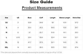 Large: Bust: 39.4″, Cuff: 26.6″, Length: 52.4″, Sleeve Length: 14.4″, Waist Size: 32.7″