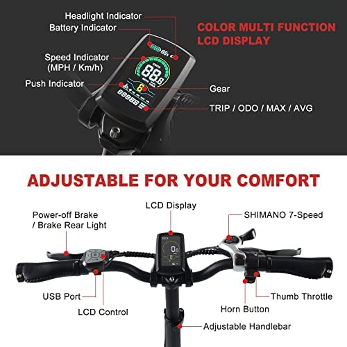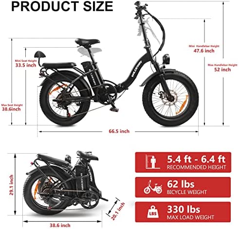 【Tips】– Bike weight: 62 lbs. Applicable height: 5’4”-6’4”. Package Included: Bike; Battery; Charger; Tool kits; Backrest; A pair of Rear pedal; User manual; a Christmas gift (bike helmet-Separate shipping)..