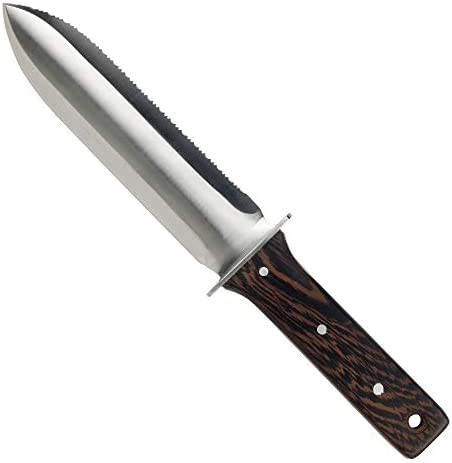 PREMIUM QUALITY MATERIALS: our garden digging tool is made of high polished rust-proof 440 stainless steel blade and redwood full tang handle. A very hard, smooth and water resistant wood, allows you to be comfortable when holding it and will not slip off your hands. The thick stainless steel of the blade extends all the way to the end of the wooden handle, and fix them together with 3 rivets. You never have to worry about bend or break while using.