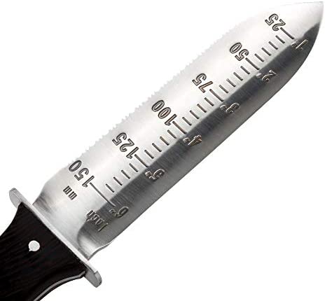 TWO WORKING BLADE EDGES: Sharp blade on one side for cutting, serrated on the other for sawing, with depth scale markings for accurate planting and measuring.