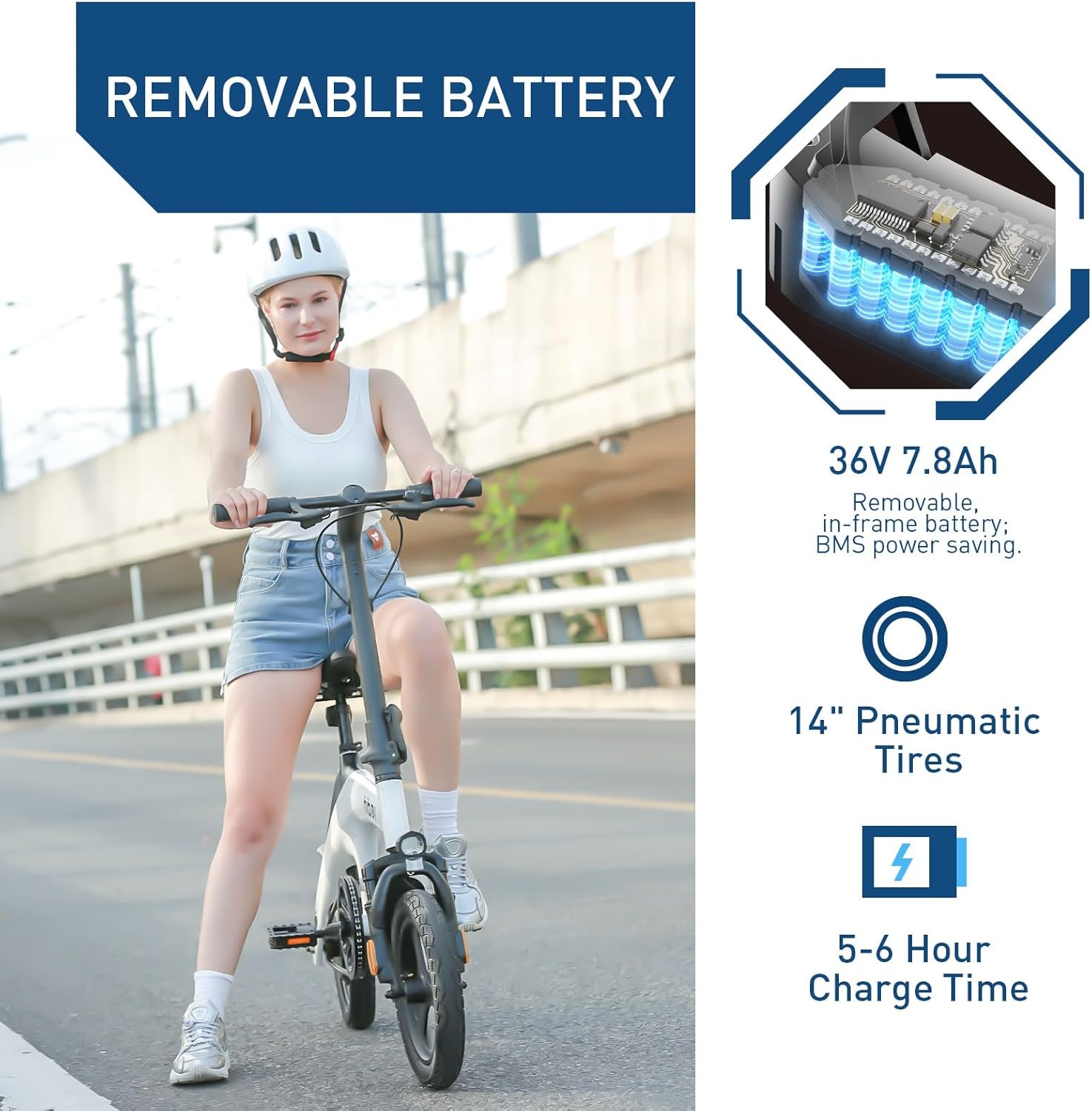 【Foldable Design】The 14-inch small electric bike is perfect for urban commuters. And for easy storage, the foldable handlebar design makes it easy to store in a small apartment, office, or even in the trunk of a car.