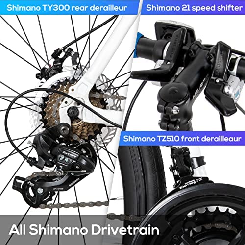 【Shimano Drivetrain】The road bike has a upgraded Shimano 21 speed shifter and derailleaur has a wide range of gears for riding on any terrain.You want to invest in higher-quality performance parts that will keep pace with you as you continue to hone your road cycling skills.