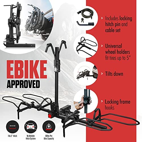 Transport your electric bikes safely and securely with this trailer hitch bike rack 2 bikes. Our bicycle racks for cars with universal wheel holders accommodate bike tires up to 5 inches wide.