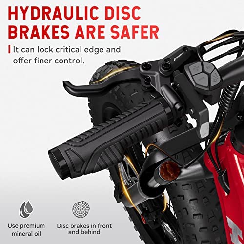 ▶【20×4.0” FAT TIRES EBIKE & DUAL SHOCK ABSORBER】: Upgraded 4.0” wide puncture-resistant fat tires e bike have a better shockproof function and stronger stability, can easily go through bumps, snow, sands, rocks, hills, curbs, etc. The excellent suspension in the front fork and sensitive disc brakes made for a smooth and comfortable safety ride on all-terrain roads.