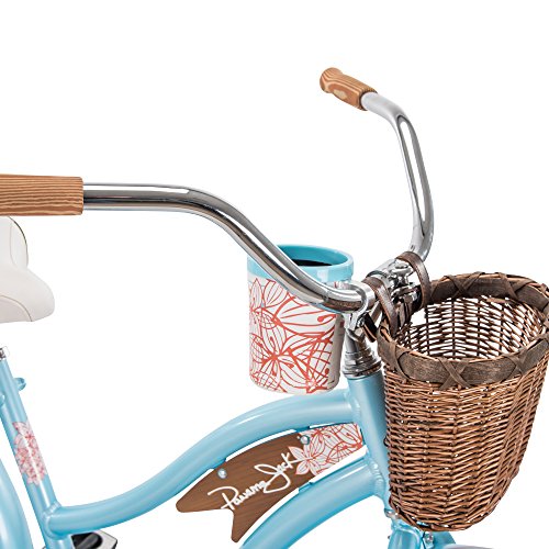 This stylish beach cruiser is ideal for ages 12-19 and a rider height of 58-70 inches. Designed with the Perfect Fit frame, this single-speed cruiser may be the most comfortable bike you’ll ever ride. This cruiser has a lightweight aluminum frame that delivers more rolling momentum so it’s easier to pedal for speed and acceleration. The frame is backed by our limited 10-year warranty (see owner’s manual for details). The rear coaster brake provides dependable control, just pedal back to stop; kickstand included. Sun-drenched tan color on the seat and wheels combine with the ocean blue frame to deliver a look that just coaxes you to the boardwalk. The clear coat over the frame’s graphics ensures it will keep its fabulous appearance year after year. The soft, cork-style grips maintain a light touch, ride after ride. The wicker basket is perfect for carrying a picnic lunch. The tropical flowers on the chain guard, beverage holder and frame insert add a laid-back feel to this beautiful ride. Generously padded for comfort, the seat has the Panama Jack logo printed in back; dual springs add comfort. Wide black tires with white sidewalls provide good traction while splash-resistant fenders block unexpected splashes.