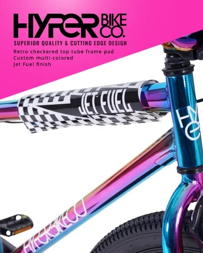 A SUPERIOR QUALITY BIKE WITH A CUTTING EDGE DESIGN. The Hyper BMX bikes 29 Inch allows you to do all your tricks in style with a custom multi-colored Jet Fuel finish on the durable steel frame, forks, and handlebars with a padded seat and top tide.