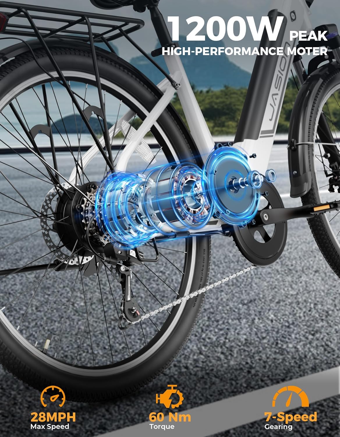 【48V 11AH Removable Battery& 62Miles Long Distance】Jasion Roamer ST Ebike represents the pinnacle of excellent urban commuting, offering an exceptional riding experience and simple stylish style. This electric bike is equipped with 528WH large battery, this allows a longer ride time, providing up to 62 miles range per charge (PAS Mode). The Electric Biclcye removable battery makes it easy to charge, whether at home or work (5-6 hours fully charged).