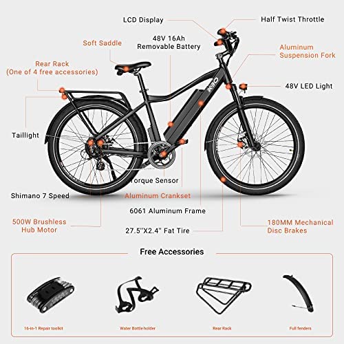 【Package Content】the Free accessories you can get includes: kickstand, fenders, rear rack, 16-in-1 repair tool, water bottle holder. You will received 90% pre-assembled KBO ebikes and step-by-step manual.