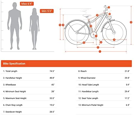 【30-45Miles Single Ride】Tornado E-bike is powered by a removable 48V 14Ah Battery. 672Wh capacity ensures a round-trip ride of up to 45 miles on PAS mode and a total of 30 miles on pure electric mode. Charging time is reduced to 5 hours to get full with the Smart 54.6V 2 Amp Charger. You’re able to recharge your phone with the USB charging port on the battery.