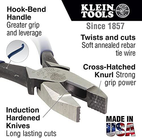 The aggressive teeth on knurl of these Ironworker’s Pliers provide a strong grip to easily twist and cut soft annealed rebar tie wire. Heavy-duty cutting knives cut ACSR, screws, nails and most hardened wire. The high-leverage design provides 46-Percent greater cutting and gripping power than other plier designs. The head is precision-hardened for on-the-job toughness. For more than 160 years, Klein Tools has manufactured premium-quality, professional-grade hand tools that deliver the performance, durability and precision needed to get the job done right. Our family of engineers, workers and craftsman continue to put six generations of expertise into every tool we create by using only the highest quality materials, superior workmanship, and keeping manufacturing as close to home as we can. Klein isn’t just the name of our company, it’s also our family name. And since we’re an American company that’s family-owned and family-run, you know you can count on us to be here tomorrow. Klein Tools doesn’t just make great products, we make great products that stand up to the demands of the professionals who use them every day … Since 1857.