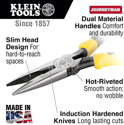 Work in confined areas with these slim Klein Tools 7-Inch Long-Nose Side-Cutters. Their heavy, high-leverage design cuts through heavier gauge wire, and the knurled jaws enable wire wrapping and looping. 7-Inch slim head pliers ensure easy work in confined areas. Knife is induction hardened to deliver precise cut. Pliers with knurled jaw offer better gripping power. Hard, black material for toughness and durability. Soft material on outer surface for comfort and a firm grip. Color-coded handles allow quick identification of tool. Custom, US-made tool steel. For more than 160 years, Klein Tools has manufactured premium-quality, professional-grade hand tools that deliver the performance, durability and precision needed to get the job done right. Our family of engineers, workers and craftsman continue to put six generations of expertise into every tool we create by using only the highest quality materials, superior workmanship, and keeping manufacturing as close to home as we can. Klein isn’t just the name of our company, it’s also our family name. And since we’re an American company that’s family-owned and family-run, you know you can count on us to be here tomorrow. Klein Tools doesn’t just make great products, we make great products that stand up to the demands of the professionals who use them every day . Since 1857.