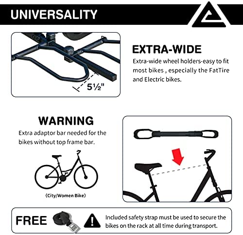 [ BIKE COMPATIBILITY ] – Easily transports up to 2 bikes and is compatible with 2″” hitch receiver. Fits most frame sizes, shapes and style including Fat Tire and Electric Bikes . Bikes with low Y-frame may require the use of an Bike Frame Adapter for better support .Maximum capacity of 70Ibs per bike.