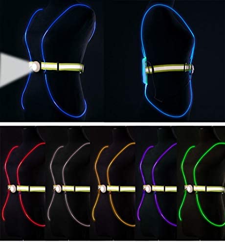 MULTI COLORS ON ONE VEST—-Change between 6 super bright pure colors : Red, Blue, Purple, Pink, Green, and Orange. Modes are easily selectable at the press of a button, easy to access. Three Light Options: multi colors change alternately—fixed favorite colors—multi colors flash alternately-off. The Led reflective vest through flexible fiber optic cables and 3M reflector chest belts cover the shoulders, chest, waist and back which provide 360°protection. Find you in any light condition.