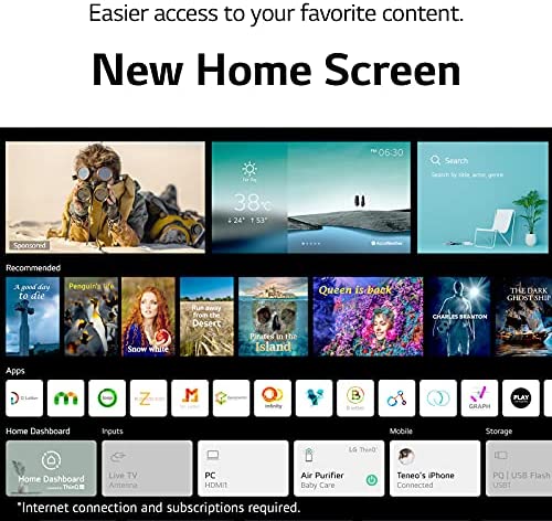 HOME CINEMA EXPERIENCE: Get breathtaking picture and audio that makes you feel like you’re in the action with Cinema HDR, Dolby Vision IQ & Dolby Atmos. See movies exactly how directors intended with Filmmaker Mode. And with built-in access to Netflix, Prime Video, Apple TV plus, Disney plus and LG channels, your favorite content is at your fingertips.