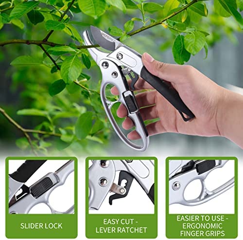 MEPEREZ Garden clippers, German pruners, ratchet pruning shears, work 3 times easier, for trimming rose, floral, tree, live plants, sharp scissors gardening tools, arthritis weak hand snips