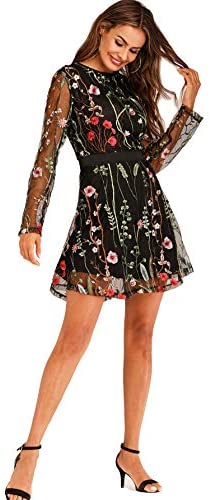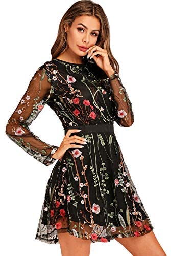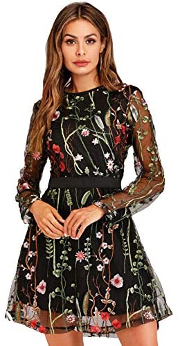 Function: Spherical Neck, Lengthy Sleeve, Quick Mini Costume, Cocktail Costume, Embroidery, Distinction Mesh, Black gown, Floral Costume, Social gathering Costume, Overlay Costume