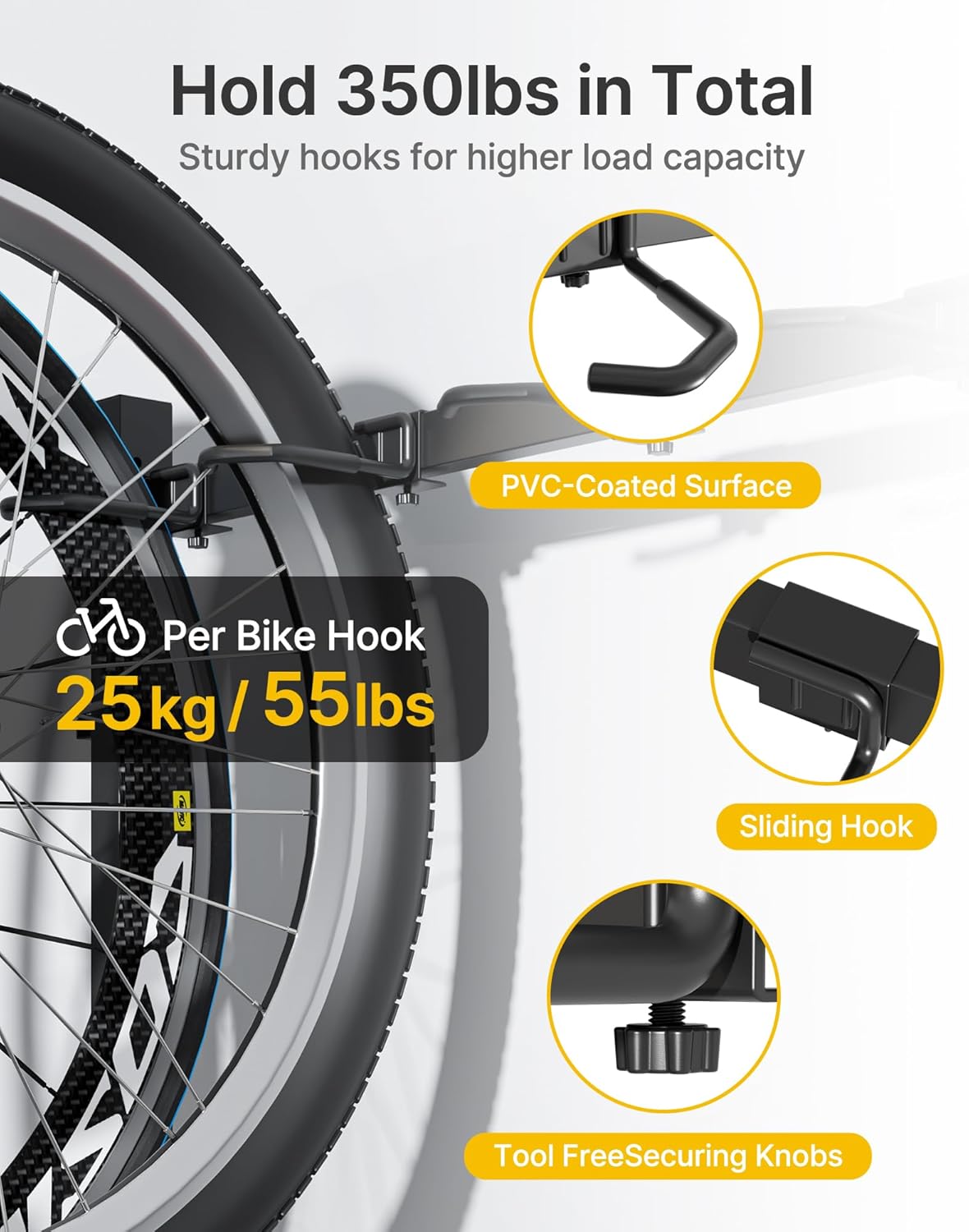 INDUSTRY LEADING HOOK ECOSYSTEM: Revolutionize your bike storage rack system! 5 sliding PVC-coated hooks (55lbs each) + 6 height-adjustable accessory hooks (2 helmet + 4 utility). Securely organize bikes, helmets, and gear in one vertical bike stand station.