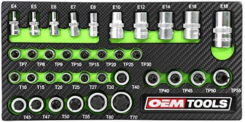 The OEM TOOLS 35 Piece Multi-Drive Star Socket Set comes with a variety of star sockets for the most common jobs. This socket set comes in an EVA Tray, which is a tough tool box foam organizer, and this green socket organizer is designed to fit securely in your cabinet or tool box. Our OEM socket organizer seats each socket perfectly, so you’ll never need to worry about dislodged sockets due to tool box movement. And the OEMTOOLS Socket Tray features custom tool-shaped cuts in a Hi-Vis green, making it noticeable when a star tool is missing. The OEM tool socket organizer also includes marked sizes for easy identification of the right socket for the job. Each socket in our torx socket organizer set is made with a heat-treated alloy steel for more strength and longevity, and sockets in this torx socket tray feature a satin chrome finish that is easy to clean, prevents rust, and won’t show prints. These torx socket sets have a no-slip design with off-corner loading for greater torque and more socket-to-fastener contact, which prevents fastener rounding. OEM TOOLS SOCKET SET INCLUDES: 1/4″ Drive Star: T10, T15, T20, T25, T27, and T30; 1/4″ Drive Tamper-Proof Star: T7, T8, T9, T10, T15, T20, T25, and T30; 3/8″ Drive Star: T40, T45, T47, T50, and T55; 3/8″ Drive Tamper-Proof Star: T40, T45, T50, and T55; 3/8″ Drive Female Star: E10, E12, E14, and E16; 1/2″ Drive Star: T60 and T70; 1/2″ Drive Female Star: E18.