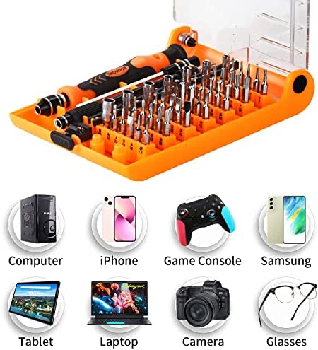 【Wide Application】46-in-1 screwdriver tool kit contains 42 interchangeable magnetic bits, screwdriver handle, extension rod, flexible shaft, magnetizer. Whether you are a amateur or a professional, you can easily use this electronics repair tool kit to repair electronic equipment such as computers, PS4, Xbox, iPhone, mobile phones, tablets, laptops, cameras, and more.