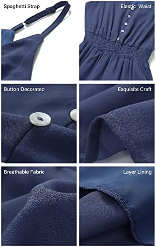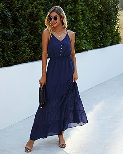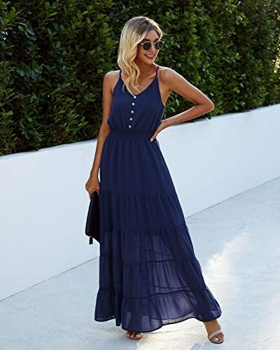 PRETTYGARDEN V Neck Maxi Spaghetti Strap Chiffon Button Tiered Beach Long Dress