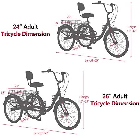 Steady and Sturdy Design: This 3 wheeled bike is constructed with carbon steel. The triangle structure is designed for more stead-ability so that seniors and young can easily ride to go shopping, exercise your feet or carry cargo/puppies with no worry of falling down. Dimension: 66″ L x 30″ W (Width between rear wheels)