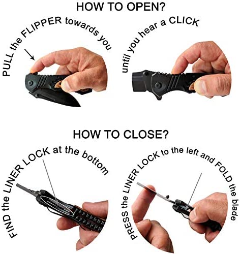 Folder Knives for Men with Burl Wood Handle and Pocket Clip. 7.75″ opened length, 4.5″ closed length, 3.25″ blade length. Black STAINLESS STEEL 3MM Thick Blade. Great Flip Knife for Hunting, Fishing, Camping, Outdoor, Hiking, Emergency, Work, Utility use and DIY Activities. MultiFunction tool is not just a knife, it also can be an emergency glass breaker, durable rope cutter and can opener..